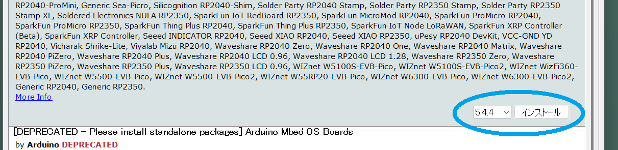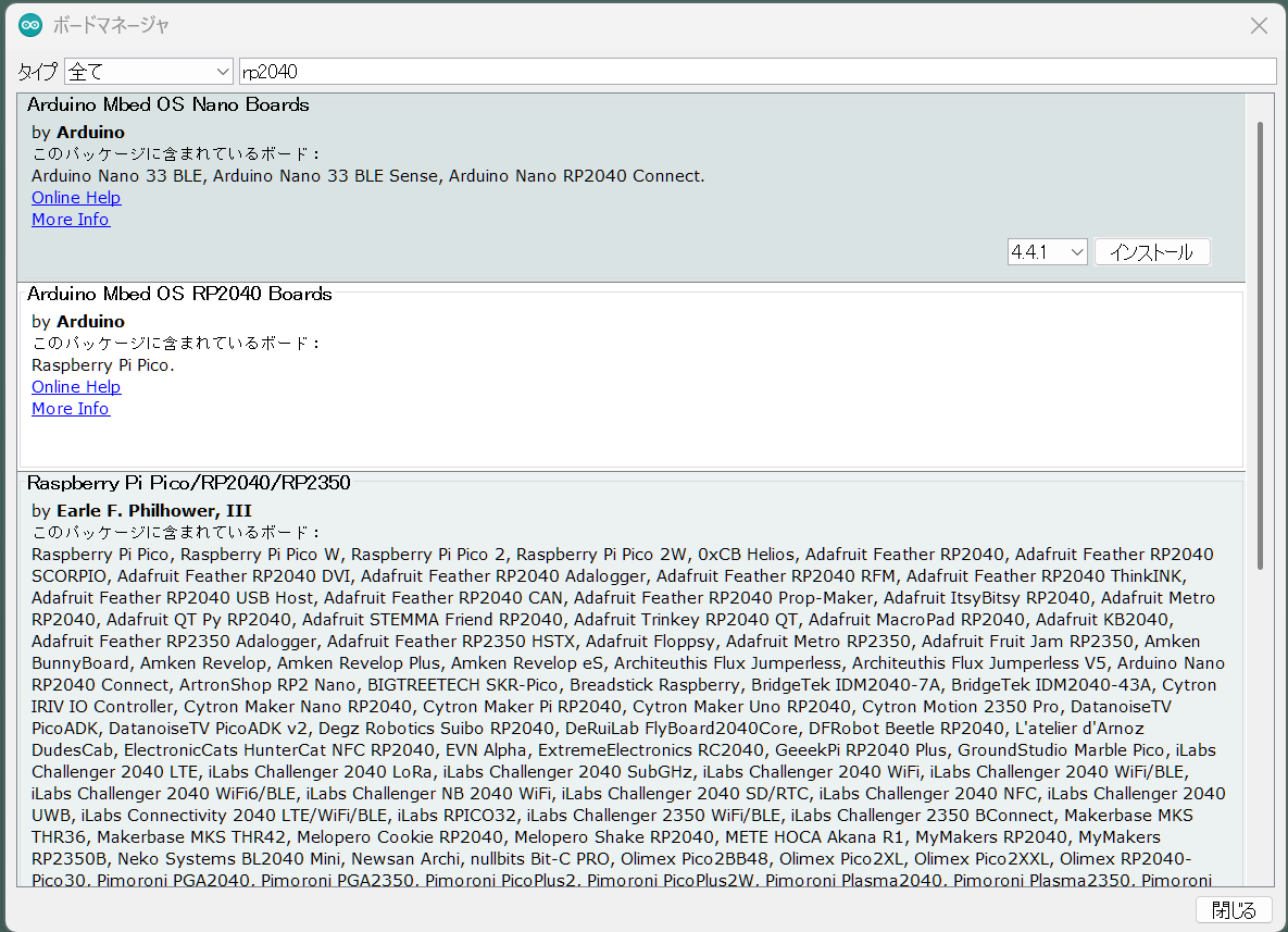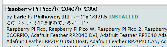 ダイアログ上部の検索フィールドに RP2040 と入力すると、おそらく以下のように Raspberry Pi Pico/RP2040/RP2350 という目的の項目が表示される。これが arduino-pico である。