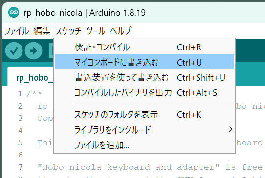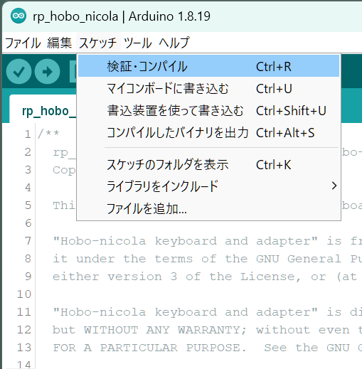 各種ハードウェアに対応したArduino用のhoboNicolaプログラムで、最新版は GitHub のリポジトリから入手できる。 - Arduino IDE 1.8.19