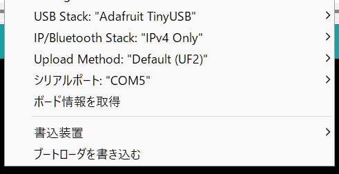 対象ボードを選択すると、ツールメニュー にはそのボードのためのビルド用パラメータが表示される。