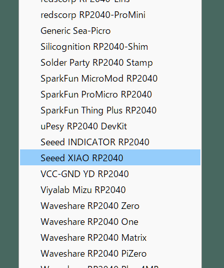 ボード一覧の下のほうにある Seeed XIAO RP2040 を選択する。