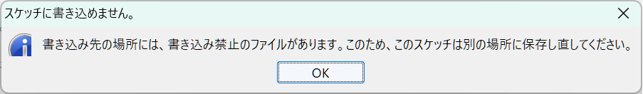 Arduino では、安全のためにスケッチ例として開いたファイルを上書き保存しようとすると以下のようなメッセージが表示される。