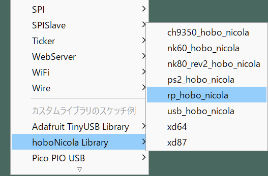 この hoboNicolaLibrary-179 内には、ライブラリファイルとしてpio-usb-hoboNicolaで使うスケッチの原型がスケッチ例として含まれている。