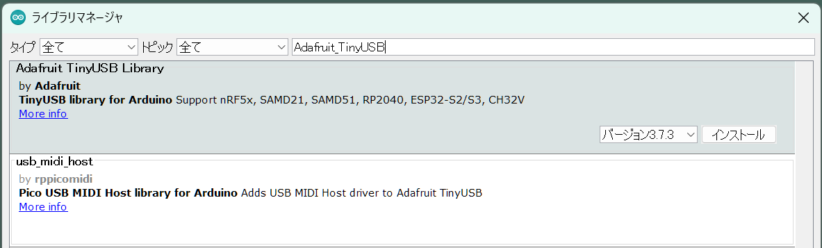 次に同様の手順で Adafruit_TinyUSB for Arduino ライブラリを導入する。