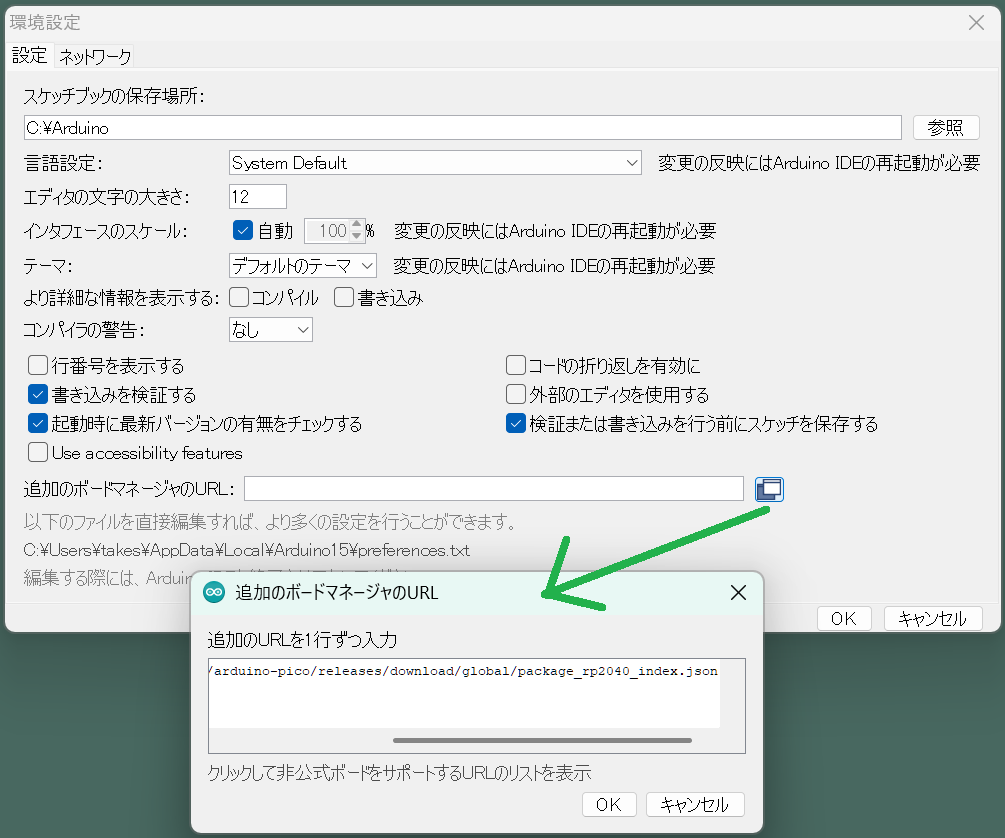 まず、Arduino IDEが標準ではサポートしていない RP2040やESP32といったマイコンを使ったボード用のコアパッケージを取得するためのURLを設定する。