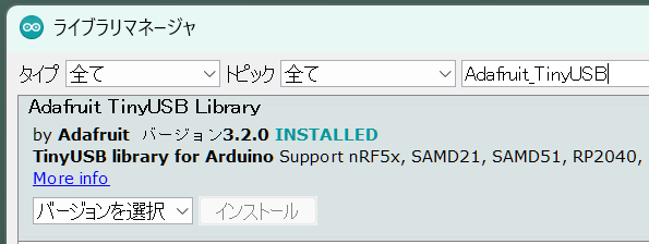 バージョン 3.2.0 を選択しインストールする。やはり、Adafruit関係のほかのライブラリもインストールするかどうかを問われるが、TinyUSBライブラリのみをインストールする。