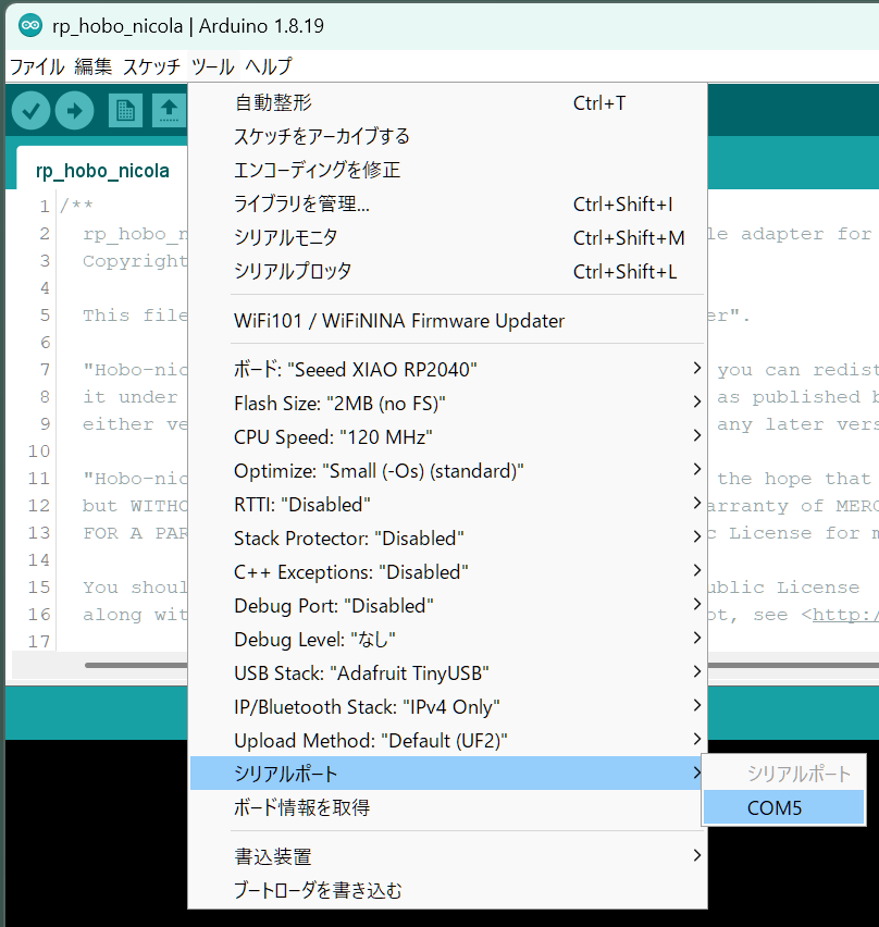 このPCの場合、もともとシリアルポートが存在しないので、ここに表示されている COM5 がXIAOとの接続で現れた仮想シリアルポートということになる。このシリアルポートを選択する。
