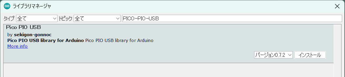 ダイアログ上部の検索フィールドに Pico-PIO-USB と入力すると、対象となるライブラリが一つしかないので以下のように表示される。