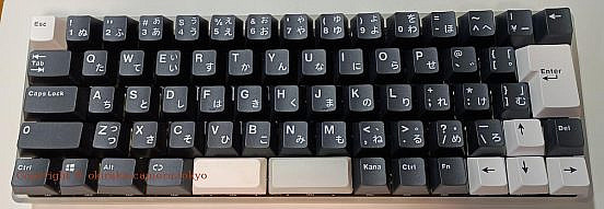 NICOLA 配列のかな刻印が施された市販キーキャップは存在しないため、今のところ JIS カナ刻印のキーキャップで代用 しています。