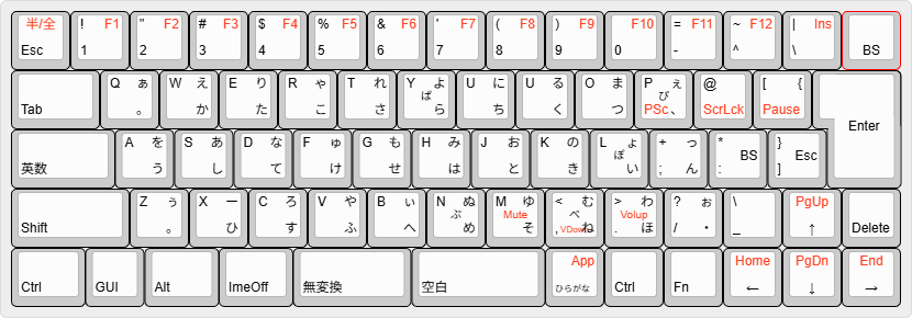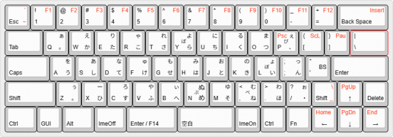 なお、PC 側が日本語キーボード設定のときにUSレイアウトのキーボードを接続すると、以下のような配列となります (キーボード自体は日本語レイアウトに設定)。