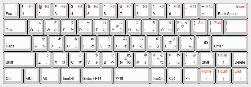 USレイアウトではキー数が不足するため、右側のShiftが _ (アンダースコア)、Enterの上のキーのFnキーオン側が、\ | となります。