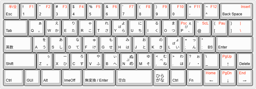 - 赤字は、Fnキーを押しながら入力したときのキー。